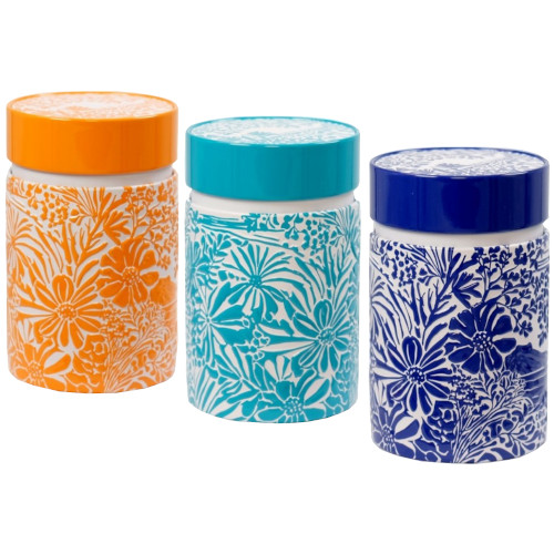 Lata redonda en relieve, con tapa a presión, para conservar 150 gr. de té. 7,5cm diámetro. 11,7cm alto. 3 modelos.