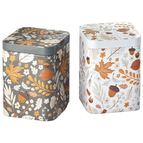 Lata cuadrada en relieve, con tapa gruesa, a presión, para conservar 100 gr. de té. 7,3cm largo. 7,3cm ancho. 10cm alto. 2 modelos.
