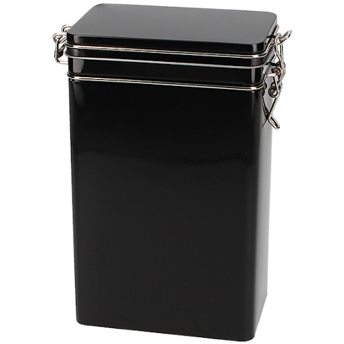 Lata negra rectangular, con tapa hermética, para conservar 500 gr. de té o café. 11,7cm largo. 7,6cm ancho. 19,6cm alto.