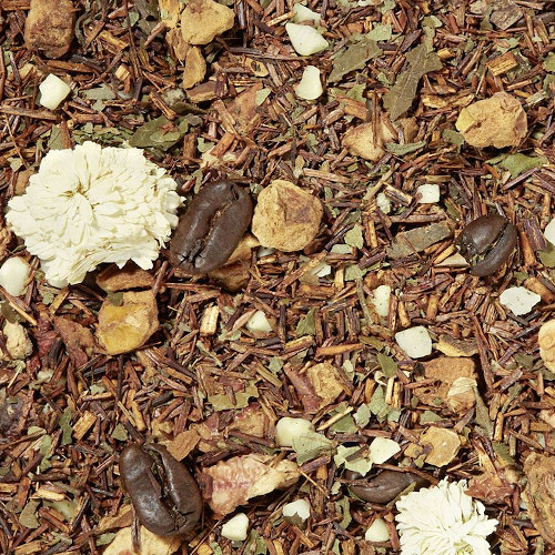 rooibos, trozos de manzana, TROZOS DE ALMENDRA, hojas de mora, granos de café arábica descafeinado, aromas, trozos de canela, manzanilla romana