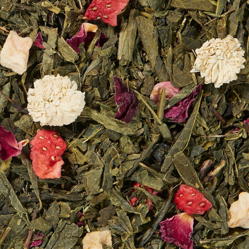 té verde, aromas, trozos de fresa, trozos de manzana, flores de jazmín, pétalos de rosa